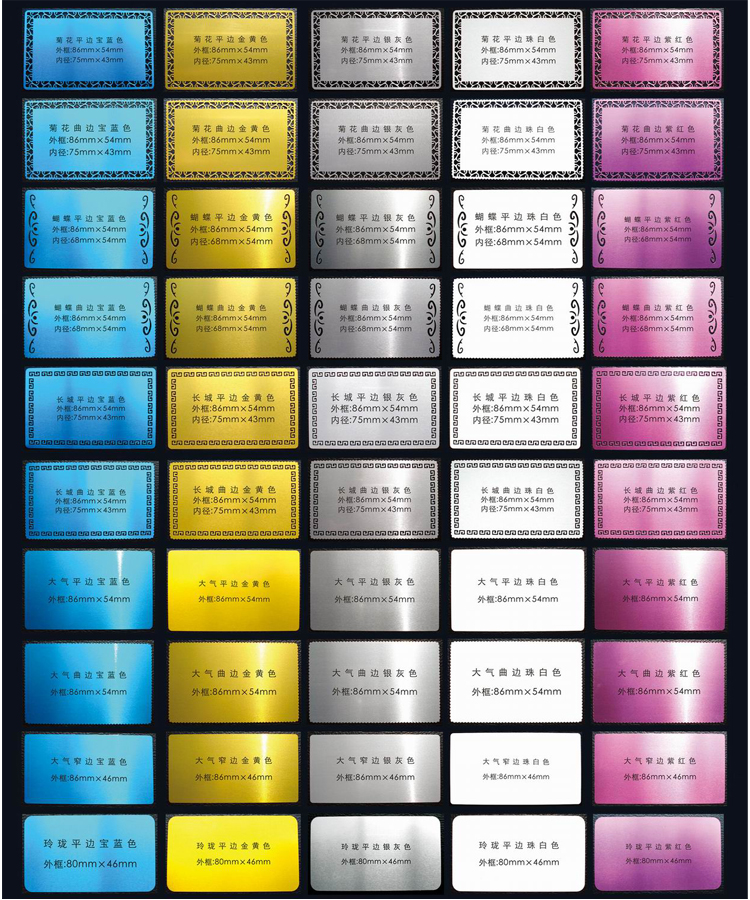金属åç‰‡çš„å¤–æ¡†äØ“86*54毫米(玲ç‘åž?0*46毫米åQŒå¤§æ°”窄è¾ÒŽ˜¯86*46毫米)åQ›å…¶åŸºæä¸ºé“åˆé‡‘åQŒé¢œè‰²åˆ†ä¸ºé‡‘ã€é“¶ã€ç™½ã€è“ã€çº¢½{‰è‰²åQ›æ¬¾å¼åˆ†ä¸ºé•‚花型åQŒå¤§æ°”型和玲ç‘åž‹½{‰èŠ±åž‹ã€?br /> 100å¼?ç›?/span> |
